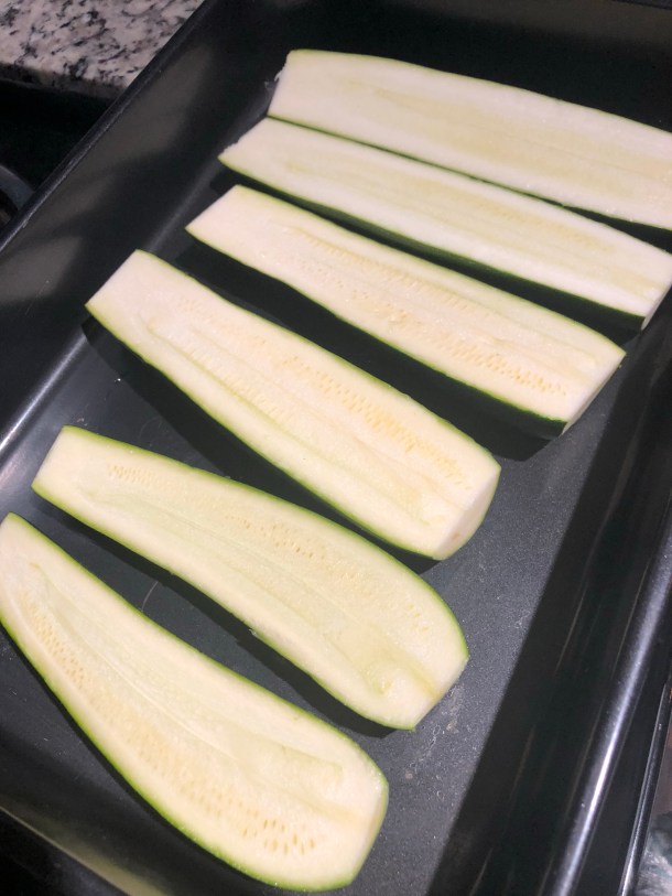 - Cut tops and bottoms off zucchini and sliced lengthwise